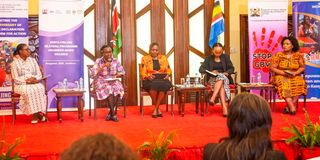 From left; GBVRC Executive Director Alberta Wambua, Chief of Party for the UKAid Peace and Security program Jaki Mbogo, CEO at Vilcom Networks Limited Agnes Limo, Executive Director at Kewopa Mercy Mwangi and Men and Boys Ambassador Faith Nashipae in a panel discussion during the National Gender Sector Working Group meeting at Safari Park Hotel in Nairobi on January 27, 2025.