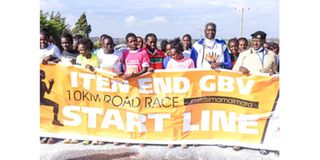 Elgeyo Marakwet Governor Alex Tolgos (centre) and other guests join athletes before the start of the Iten End Gender Violence 10km Road Race in Elgeyo Marakwet County on December 05, 2021. The government has been urged to take sexual harassment complaints by men seriously.