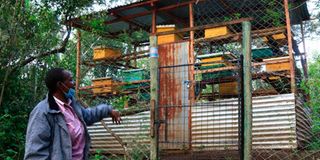 Rose Nyamathira, an official of Change Ambassadors group next to one of their bee houses at Chaka in Nyeri, on March 24, 2021.
