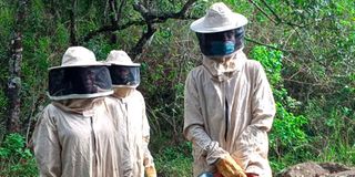 Members of Change Ambassadors group in Chaka , Nyeri County, in their beekeeping suits.