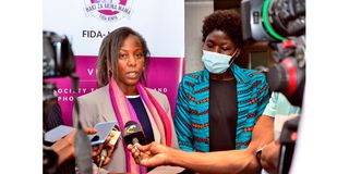 Fida-Kenya Chairperson Nancy Ikinu (left) briefs media during the Women Leadership Conference held at a Nairobi hotel in August last year. The conference also marked the the launch of Vote A Dada Campaign, aimed at empowering women to compete in the upcoming general election.