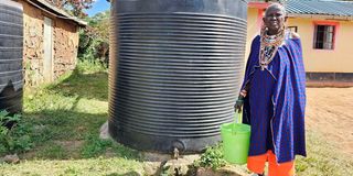 Emily Teresia Oluma stands next to a 5,000-litre water tank she received from Maendeleo ya Wanawake, at her compound in Bisil, Kajiado County, on February 24, 2025.