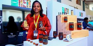 Damaris Chebet showcases her products at her exhibition tent during the NXT HER Summit held at Mövenpick Hotel, Nairobi, on August 22, 2025. She travels from Nairobi to Baringo and West Pokot to source authentic honey straight from the hive.
