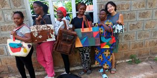 From left: Faith Mwende, Ruth Katuki, Charity Maina, Evelyn Awino and Mary Muthoni pose for a photo with bags that they made, at Kabati Village in Murang'a County on December 6, 2024.