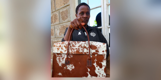 Charity Maina displays a leather bag at Nashipai Leather Kenya at Kabati, Murang'a County on December 6, 2024.