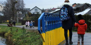 A violence survivor and her child walk across a bridge during an excursion to the countryside surrounding Lviv, organised by the Centre for Women’s Perspectives.