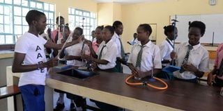 Students of Nyiro Girls Secondary School in Samburu County in the school laboratory during a science practical lesson. UN Women and Unesco have raised the red flag over the few number of girls in the STEM field.