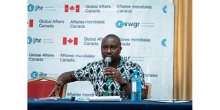NTV Senior political reporter Kennedy Mureithi, speaks during the Annual Human Rights Conference last Thursday. He urged women to push for the media space whenever they feel left out.