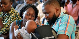 Baby Samantha Pendo’s parents Joseph Abanja and Lencer Achieng’ with their other baby, Jackins, at Kisumu Law Courts on February 14, 2019, during the ruling on the public inquest seeking to establish the killers of their daughter. It is a gloomy Mother's Day for Lencer.