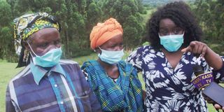 Ms Daisy Chelang'at (centre) with her mother Ms Lucio Langat (left) and Ms Margaret Ruto during the second exhumation of Ms Chelang'at's son's remains at Bomet cemetery on Friday, March 26. 2021.