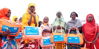 Women get essential supplies from UNFPA and Kenya Red Cross at Young Muslim High School camp in Garissa on December 19, 2023.
