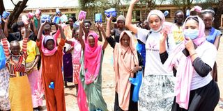 Some of the 300 girls from Burat Ward in Isiolo County who received sanitary towels from Drop of Dignity Youth Group on September 19, 2020.