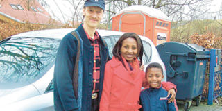 Brixton Mwenda, right, with his aunt Jacqueline Mbogo and her husband Walter Hellmann outside the children’s home where Mwenda was being held. Photo/CORRESPONDENT