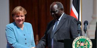In this file photo taken on July 12, 2011 German Chancellor Angela Merkel (left) shakes hands with Kenya's President Mwai Kibaki at the State House in Nairobi.