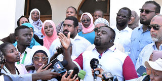 Mwalimu Mwaguzo, the chairman of the private recruitment agencies operating under the Pwani Welfare Association at a press conference in Mombasa.