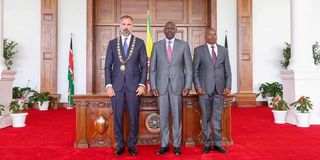 President William Ruto, Deputy President Kithure Kindiki, and His Highness Prince Rahim Aga Khan at State House, Nairobi, on August 26, 2025