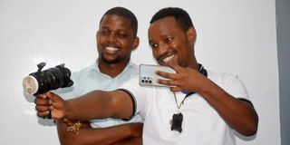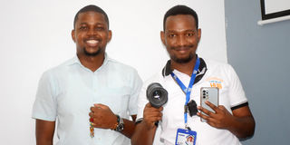 From left, Iddi Ganguma and Elishah Shammah, a gamer, photographer, affiliate marketer and tech enthusiast, take a selfie during a visit to the Nation Mombasa Bureau office on February 21, 2024.