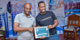 From left, Iddi Ganguma and Elishah Shammah, a gamer, photographer, affiliate marketer and tech enthusiast during a visit to the Nation Mombasa Bureau office on February 21, 2024.