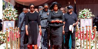 Ida Odinga, widow of former Prime Minister Raila Odinga and her children, Rosemary (left) and Winnie (centre) arrive at the Jaramogi Oginga Odinga University of Science and Technology in Bondo, Siaya County, for her husband's funeral mass on October 19, 2025.