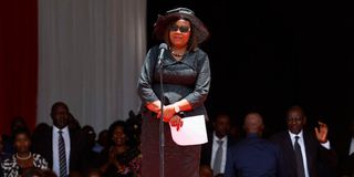 Former Prime Minister Raila Odinga's widow, Ida Odinga, delivers a speech on during her hurband's funeral at the Jaramogi Oginga Odinga University of Science and Technology in Bondo, Siaya County, October 19, 2025.