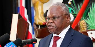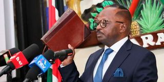The Independence Electoral and Boundaries Commission (IEBC) Chairperson, Erastus Edung Ethekon, takes an oath during the swearing-in of the new IEBC Commissioners at the Supreme Court in Nairobi on July 11, 2025.
