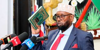 The Independence Electoral and Boundaries Commission (IEBC) Commissioner Hassan Noor Hassan takes an oath during the swearing-in of the new IEBC Commissioners at the Supreme Court in Nairobi on July 11, 2025.
