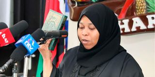 The Independence Electoral and Boundaries Commission (IEBC) Commissioner Fahima Araphat Abdallah takes an oath during the swearing-in of the new IEBC Commissioners at the Supreme Court in Nairobi on July 11, 2025.