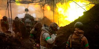 Ukrainian artillery fires towards the frontline during heavy fighting near Bakhmut, Ukraine, on April 13, 2025