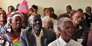 Some Mamuki Society members follow proceedings during the hearing of their case against Robin Woodcraft Stanley at the Makueni Laaw Courts on January 17, 2023. They are laying claim on a 5,000 acre ranch at Yoani Village in Makueni County.