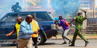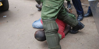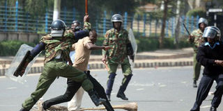 A police officer about to beat a protestor outside Anniversary Towers in Nairobi on May 16, 2016. PHOTO | EVANS HABIL | NATION MEDIA GROUP