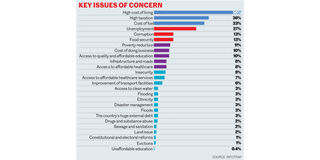 For all Kenyans, addressing the cost of living ranks high on their wish list at 56 per cent, followed by the issue of high taxation (36 per cent), cost of fuel (33 per cent), unemployment (27 per cent) and corruption at 13 per cent .