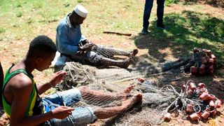 Fishermen prepare their fishing nets at Kibuyuni in Kwale County on July 2, 2021.