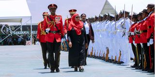 President Samia Suluhu Hassan of Tanzania inspects a guard of honour at Chamwino State House in Dodoma.