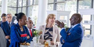 President William Ruto with the Chargé d’Affaires for the US Embassy Susan Burns (centre) and National Security Advisor to President Monica Juma during the New Year diplomatic briefing for ambassadors, high commissioners and heads of international institutions resident in Kenya, at State House, Nairobi.