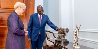 President William Ruto shows Slovenian President Nataša Pirc Musar Kenyan artifacts at State House, Nairobi on May 31, 2025.