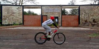A cyclist rides a bicycle past Lion's Court Lodge in Nanyuki town where Agnes Wanjiru was murdered nine years ago.