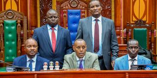 The chairperson National Assembly Committee on Defence, Intelligence, and Foreign Relations Nelson Koech (centre) Vice Chair Elijah Memusi (left) and committee members addressing the media at County Hall Nairobi, on Tuesday, April 9, 2024.