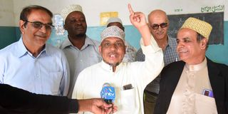 Sheikh Abubakar Bini (centre), the Chairman of the Council of Imams and Preachers of Kenya for Uasin Gishu County, accompanied by Zulfikar Osman (right), a Muslim elder, and other Muslim faithful during a past press conference at Madrasatul Huda Al-Islamiyah in Eldoret town.