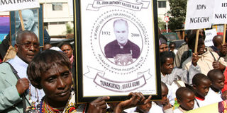 Mary Gakui from lolgorian in Transmara, carries a portrait of Father John Kaiser during a peaceful demonstration to mark the tenth commemoration since the death of Father John Kaiser, at the Holy Family Bascilica in Nairobi, August 19th, 2010.