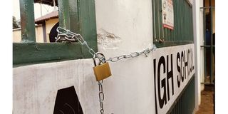 Officials of the Kenya Union of Post-Primary Education Teachers (Kuppet) lock the gates of Bungoma High School during strike.