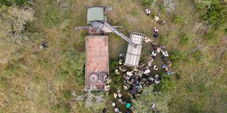 The Kenya Wildlife Service capture team prepares to load a male rhino into a lorry at Ol Pejeta Conservancy to be moved to Loisaba