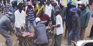 Residents at the scene of a crash involving a boda boda operator and a government vehicle on January 29, 2017. The motorcyclist died on the spot while his passenger died later at a hospital.