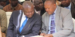 Kericho Governor Paul Chepkwony (right) with his lawyer, Peter Wanyama, at the Kericho High Court on Thursday after filing a petition in which he is seeking Sh87 billion from KTDA as compensation for small-scale tea farmers in the western rift. He has accused the tea agency of exploiting the farmers.