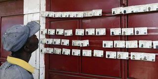 A man looking at national identity cards at a chief's office. Abdi Yusuf Ali, was found with an ID card belonging to Mohamed Kuno alias Sheikh Mahamud or Dulyadeen alias Gamadhere.