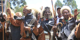 Elders sing during the 63rd commemoration of freedom fighter Dedan Kimathi at Dedan Kimathi Memorial High school in Nyeri on February 18, 2020. PHOTO | JOSEPH KANYI | NATION MEDIA GROUP