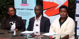 Digital civil rights attorney Mercy Mutemi (left), Content Moderators Representative Naftali Wambalo (center), and Data Labelers Association President Joan Kinyua address journalists at Siasa Place in Nairobi on August 12, 2025