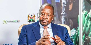 Agriculture and Livestock Development Cabinet Secretary Mutahi Kagwe address journalists during the opening of the UN food system summit (UNFSS+4) Africa region preparatory meeting held in Gigiri, Nairobi on May 5, 2025.