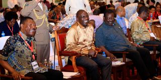 President William Ruto with the Speaker of the National Assembly Moses Wetang'ula and Musalia Mudavadi (right) during the Post-Election Seminar for the 13th Parliament in this photo taken on January 30, January 2023.