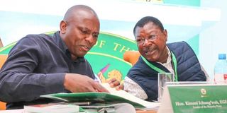 National Assembly Speaker Moses Wetang’ula (right) with Majority Leader Kimani Ichungw’a during the mid-term retreat for MPs in Naivasha, Nakuru County, on Tuesday.