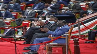 Deputy President William Ruto, President Uhuru Kenyatta, ODM leader Raila Odinga and other top officials at Bomas of Kenya in Nairobi for the launch of the Building Bridges Initiative (BBI) report on October 26, 2020.